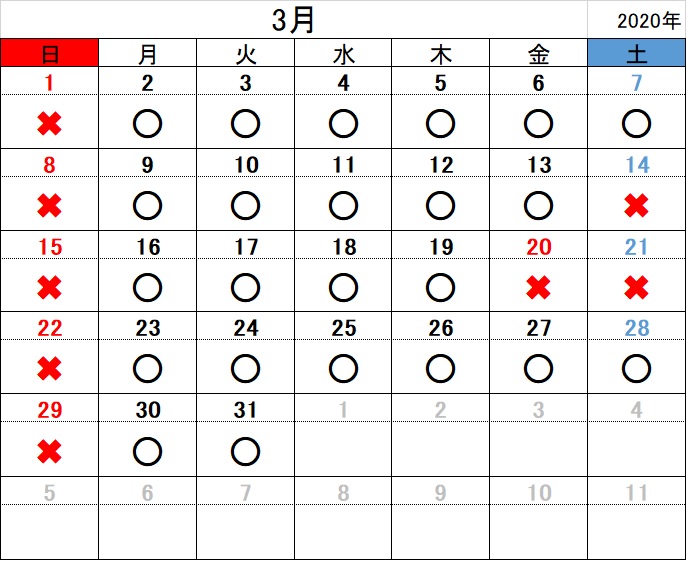 2020.02.20お知らせ 令和2年3月の開所日のお知らせ 黒〇=開所日 赤✖=閉所日 ※タスカルでは、基本「土」「日」「祝日」はお休み とさせていただきます。 また、各種お問い合わせは 平日9:00~18:00にお願いいたします。 お問合せ TEL 011-717-5211 FAX 011-717-5212