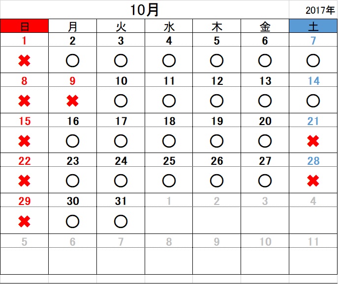 2017.09.26お知らせ 10月 開所日のお知らせ 黒〇=開所日 赤✖=閉所日 ※タスカルでは、基本「土」「日」「祝日」は お休みとさせていただきます。 また、各種お問い合わせは 平日9:00~18:00にお願いいたします。 お問合せ TEL 011-717-5211 FAX 011-717-5212