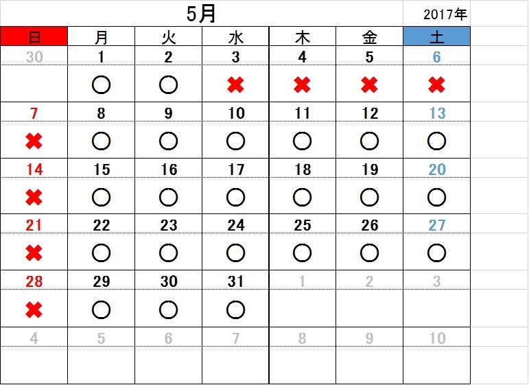 2017.04.24お知らせ 5月 開所日のお知らせ 黒〇=開所日 赤✖=閉所日 ※タスカルでは、基本「土」「日」「祝日」は お休みとさせていただきます。 また、各種お問い合わせは 平日9:00~18:00にお願いいたします。 お問合せ TEL 011-717-5211 FAX 011-717-5212