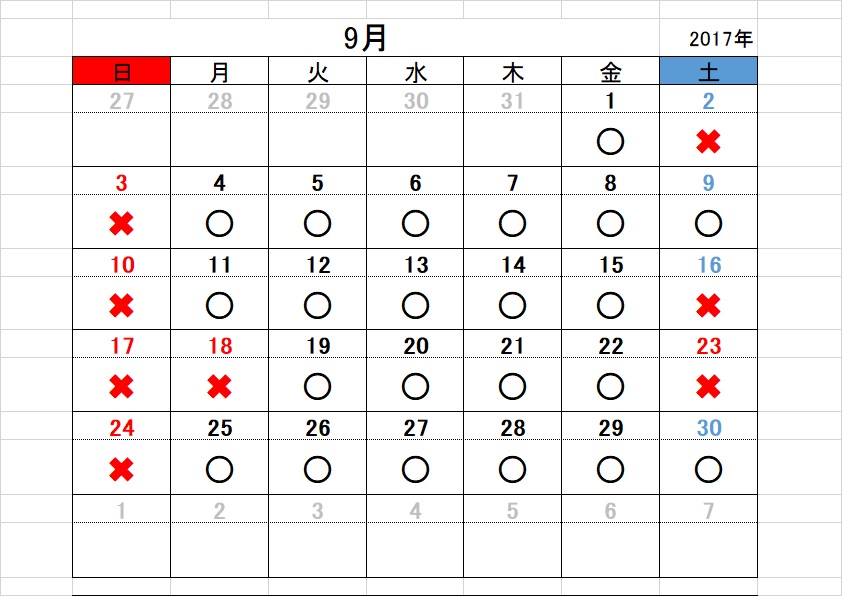 2017.08.20お知らせ 9月 開所日のお知らせ 黒〇=開所日 赤✖=閉所日 ※タスカルでは、基本「土」「日」「祝日」は お休みとさせていただきます。 また、各種お問い合わせは 平日9:00~18:00にお願いいたします。 お問合せ TEL 011-717-5211 FAX 011-717-5212
